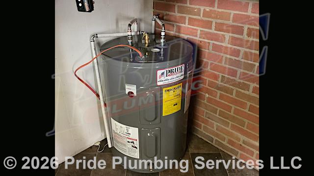 Pride Plumbing came out and replaced a leaking 38-gallon electric Whirlpool E1F40LD045V lowboy water heater with a new 38-gallon electric Rheem PROE38-S2-RH95-B lowboy model. First, after turning off the water and disconnecting the unit's electrical connections and inlet and outlet water lines, we removed and disposed of the old water heater. Then we installed the new water heater, ball water shut-off valves, PEX and stainless-steel water supply lines to the water heater connectors, a brass drain valve, and wired up the electrical connections to the new water heater (adding a Romex connector). Finally, we turned the water back on, tested for leaks, bled the air out of the water lines, ensured that the unit’s temperature and pressure (T&P) relief valve was properly vented, and set the unit to its appropriate operating temperature.