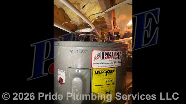 Pride Plumbing came out and replaced a leaking 50-gallon electric water heater with a new 50-gallon electric Rheem PROE50-M2-RH95 model. First, after disconnecting its electrical connections and inlet and outlet water lines, we removed and disposed of the old water heater. Then we installed the new water heater on a stand, ball water shut-off valves, PEX and stainless-steel water supply lines to the water heater connectors, a brass drain valve, and wired up the electrical connections to the new water heater (adding a Romex connector). Finally, we bled the air out of the water lines, ensured that the unit’s temperature and pressure (T&P) relief valve was properly vented, and set the unit to its appropriate operating temperature.