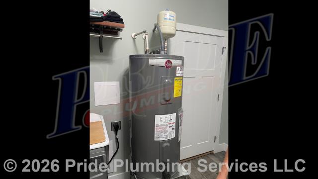 Pride Plumbing came out and replaced a leaking 38-gallon electric American lowboy water heater with a new 38-gallon electric Rheem PROE38-S2-RH95-B lowboy model. This included removing and disposing of the old water heater; and installing the new water heater, ball water shut-off valves, PEX and stainless steel water supply lines to the water heater's water connections, a brass drain valve, connecting the unit's electrical connections, bleeding the air out of the water lines, ensuring that the unit’s temperature and pressure (T&P) relief valve was properly vented, and setting the unit to its appropriate operating temperature.