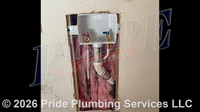 Pride Plumbing came out and replaced the hookups for a washing machine (this included installing a new ProPlus plastic washer box with quarter-turn valves, attaching the valves to the existing copper water supply lines coming up through the floor with new PEX piping and fittings, adding two new PVC bends and a bushing to the PVC drain pipe coming up through the floor (connecting onto the existing PVC drain pipe with a new no-hub coupling); and replacing the hot- and cold-water supply lines going from the boiler drains to the back of the washing machine with new braided stainless-steel ones).