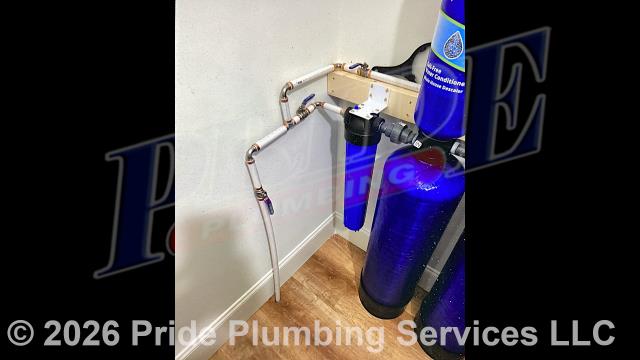 Pride Plumbing came out and performed the following work: 1) in the first-floor closet, used PEX piping and fittings to move a water shut off valve over to the location of a new water filtration system; 2) installed a new Aquasana five-stage whole-house water filtration system with a UV light; 3) installed a bypass on the system for servicing the pre- and post-sediment filters; and 4) after the system was installed, tested for leaks and bled the air from the water lines and purged the filters.
