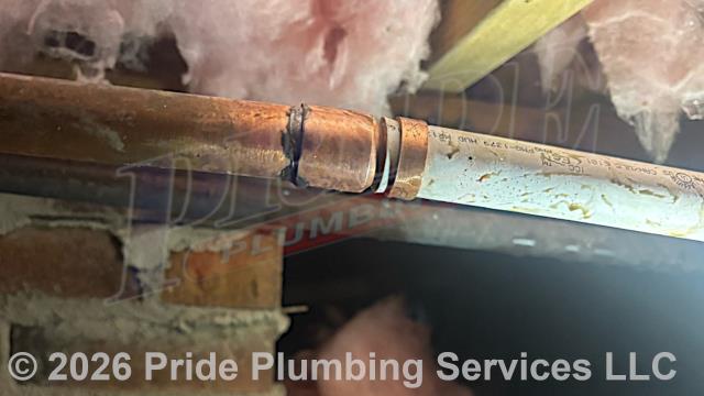 Pride Plumbing was called out for a water leak underneath the home. We found a leak on a copper water supply line. After shutting off the water, we cut out the leaking section of pipe and repaired it with new PEX piping and fittings. We then cut the water back on, drained out any debris at an outside hose bib spigot, and tested for leaks with no further issues. We also provided a cost estimate to repipe and replace the water supply lines under the house in the crawlspace, going to the fixtures in the kitchen (sink faucet, dishwasher, and ice maker), two bathrooms (sinks, toilets, and bathtubs/showers), the washing machine (installing a new plastic washer box and hot and cold hose bibs or boiler drains), and the water heater, with new PEX piping and fittings (installing new 1/4 turn water shut-off valves on each fixture inside the house along with new above-floor stainless steel braided water supply lines) and replace two outside hose bib spigots with new Woodford frost-free models.