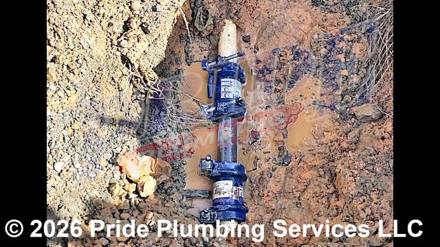 Pride Plumbing came out and performed the following work: 1) after cutting off the water, we cut a section of a concrete walkway and used an excavator to remove the section; 2) dug down to expose a section of pressure PVC water line that was leaking at a coupling; 3) cut out the leaking section of piping, replaced it with new Schedule 80 PVC pressure piping, and connected back onto the existing pressure PVC piping with two new HyMax couplings; 4) turned the water back on and tested the water line for leaks with no further issues; and 5) backfilled the area with gravel, tamped it down, and replaced the section of concrete walkway after the work had been completed.