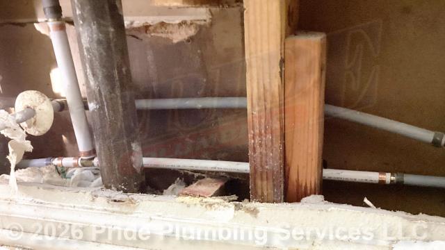 Pride Plumbing was called out for a water leak on a pipe inside a wall. After doing a thorough inspection, we found a faulty 4-inch coupling. First, we removed the leaking coupling and a short section of PVC pipe. Next, we added a new section of PVC pipe and attached it to the existing PVC piping with new Fernco and no-hub couplings. Finally, we flushed the toilet and ran the bathroom sink to test for leaks and there weren't any.